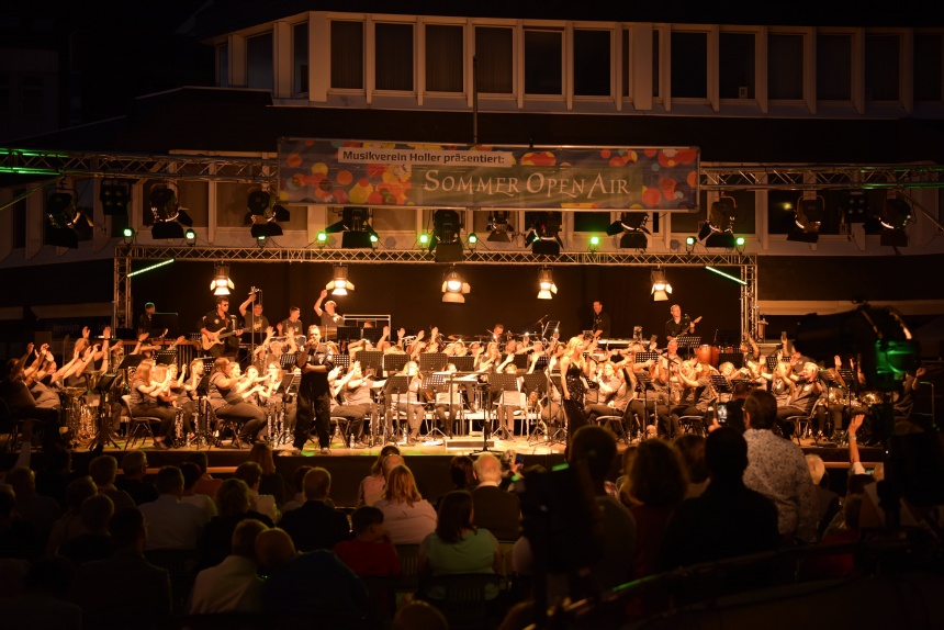 Was die drei Ensembles mit rund 100 Musikerinnen und Musikern – das Jugendorchester des Jugendmusikvereins Holler, das Sinfonische Blasorchester des Musikvereins Holler (SBO) und die Coverband Supagroove – gemeinsam präsentierten, war „erste Sahne“. So zumindest konnte man die Reaktion des allergrößten Teils der Besucher deuten, die in Montabaur echtes Open-Air-Feeling genießen konnten. Das Jugendorchester unter der Leitung von Marcus Müller eröffnete mit sinfonischer Blasmusik („Mount Everest“), Filmmusik („Pirates of the Carribean“) und Latin-Rhythmen („Masquenada“) gekonnt ein äußerst abwechslungsreiches und mitreißendes Programm, bevor das SBO und Supagroove gemeinsam auf der stattlichen 120m2-Bühne Platz fanden.