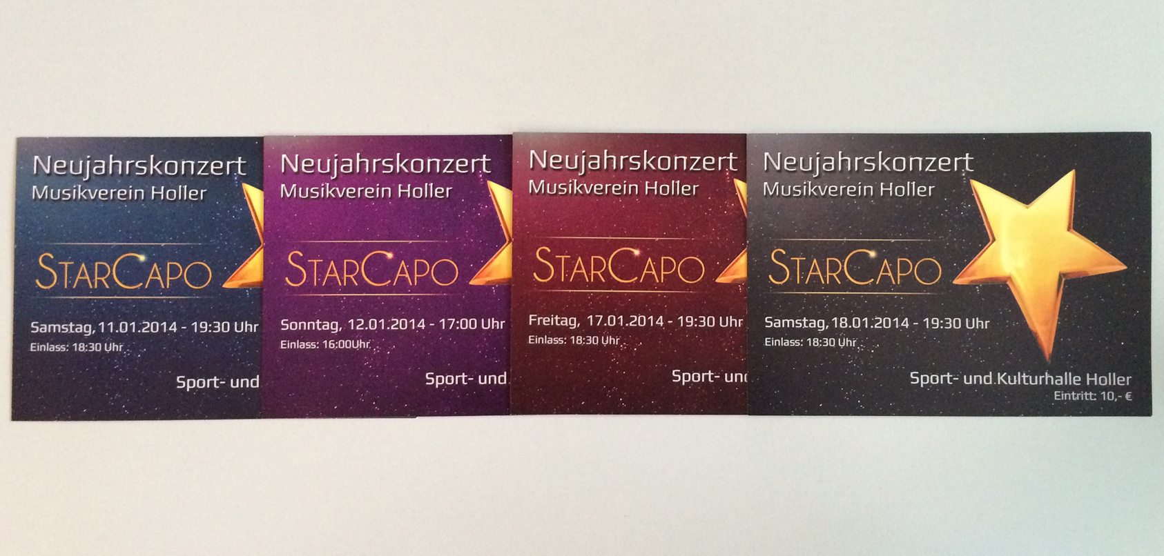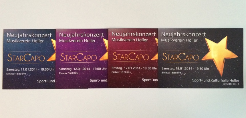 Die Eintrittskarten für die Neujahrskonzerte 2014 unter dem Motto "StarCapo" sind ab sofort verfügbar. Wenn Sie bereits Karten reserviert haben, können Sie diese ab heute jeden Freitag ab 14:30 Uhr in der Halle im Foyer abgeholen.