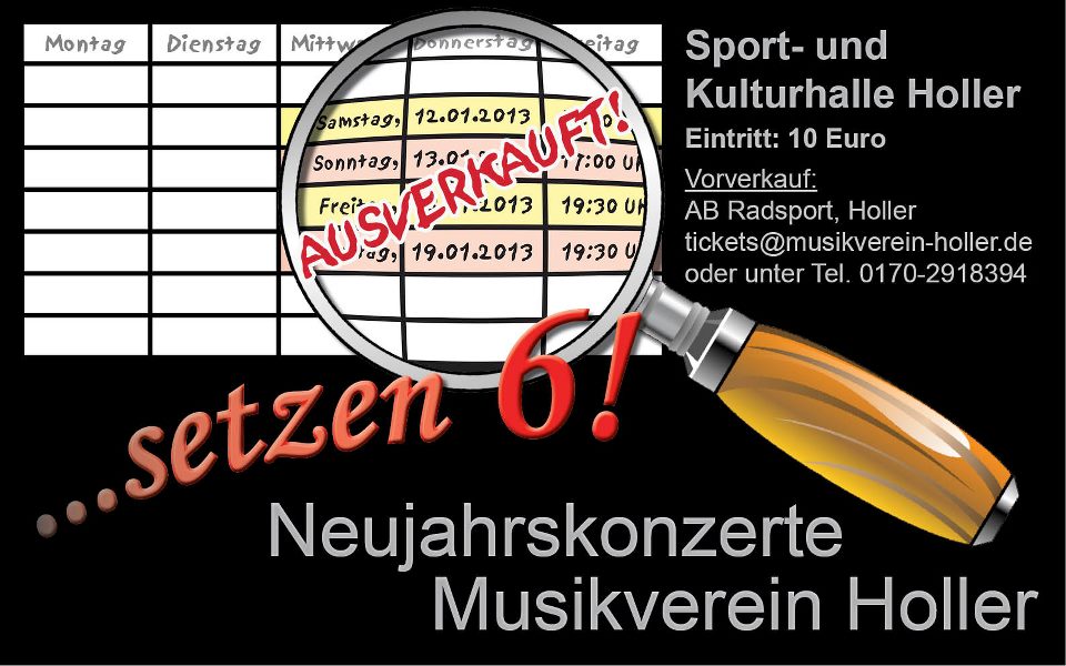 Für die Neujahrskonzerte "...setzen 6!" gibt es keine Karten mehr. Eventuell zurückgegebene Karten können unter der Telefonnummer 0170/2918394 noch erfragt werden. Die reservierten Karten werden an den Abendkassen ausgegeben.