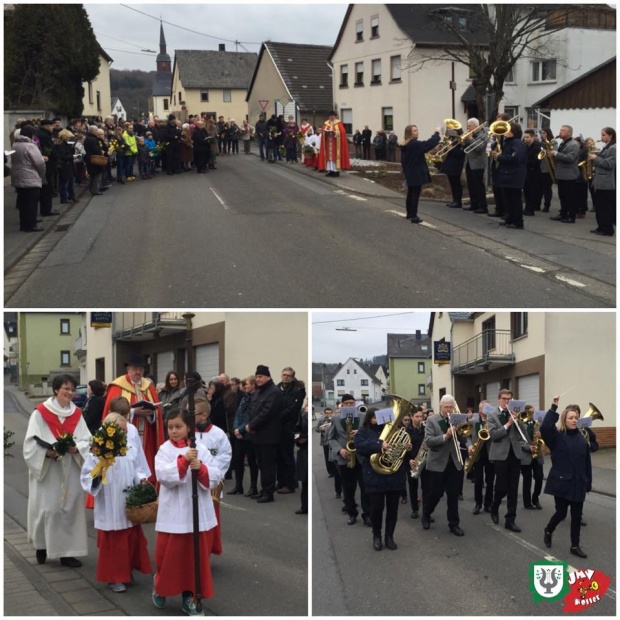 Morgen ist Palmsonntag und schon heute Abend findet die Prozession zu diesem Kirchenfest in Holler statt. Der Musikverein begleitet die Gottesdienstbesucher, Kommunionkinder und Pfarrer Westermann mit seinen Messdienern auf ihrem Weg vom Dorfkreuz in die Kirche.
