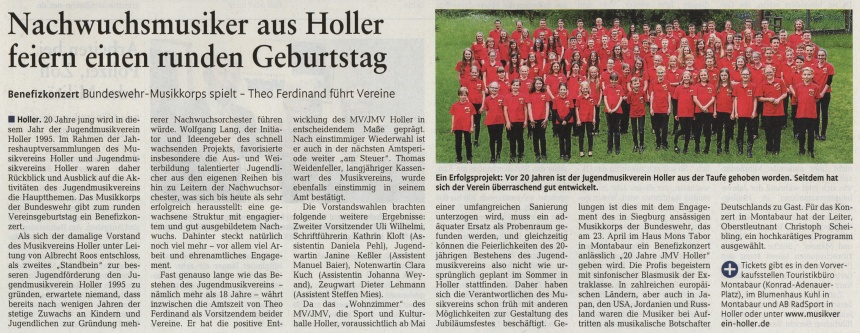 Pressevorbericht zum 20-jährigen Bestehen des Jugendmusikvereins Holler vom 02.04.15
