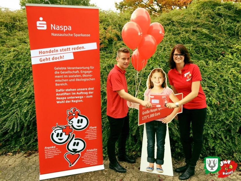 Im Rahmen der Großen NASPA-Spendenaktion, die jeweils 1.000 € an 175 gemeinnützige Projekte im Westerwaldkreis spendet, fand heute die Scheckübergabe in Heiligenroth statt. Unsere Jugendwarte Janine Keßler und Manuel Baier waren vor Ort, um den Scheck für den Jugendmusikverein Holler entgegenzunehmen.