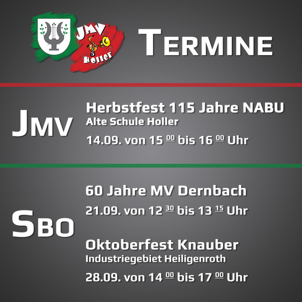 Das Jugendorchster unterhält die Gäste der NABU-Ortsgruppe Montabaur, die anlässlich ihres 115-jährigen Bestehens ein Herbstfest rund um die alte Hollerer Dorfschule ausrichtet. Das SBO gratuliert dem Musikverein Dernbach, der sein 60-jähriges Vereinsjubiläum feiert und begleitet den verkaufsoffenen Sonntag der Firma Knauber, die ihr jährliches Oktoberfest im Industriegebiet Heiligenroth veranstaltet.