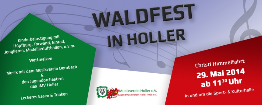Schon traditionell findet an Christi Himmelfahrt (29.05.2014) das Waldfest des Jugendmusikvereins Holler statt. Neben guter Blasmusik unserer Jugendorchester sowie dem Musikverein Dernbach wartet ein vielfältiges Unterhaltungsprogramm für Kinder auf Sie.