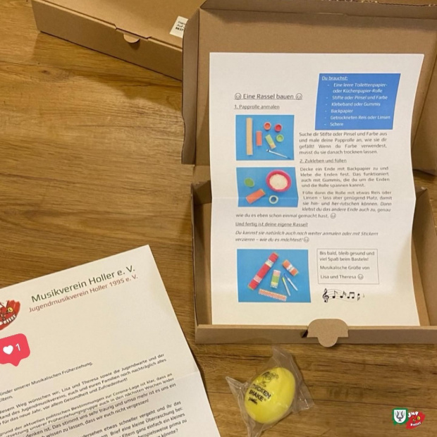 Ein Brief, ein Ei-Shaker und für die fortgeschrittenste der drei Gruppe außerdem eine Bastelanleitung für eine Rassel sollen unserem Nachwuchs zeigen, dass wir sie in diesen Zeiten nicht vergessen und uns sehr auf das Wiedersehen freuen!
