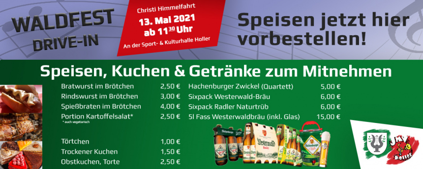 Am Donnerstag, 13. Mai, ab 11:30 Uhr können Sie vor Ort inklusive Getränke alles abholen. Um besser planen zu können bitten wir um Vorbestellung der Speisen bis spätestens Montag, 10. Mai, 12:00 Uhr unter www.musikverein-holler.de/kuchen