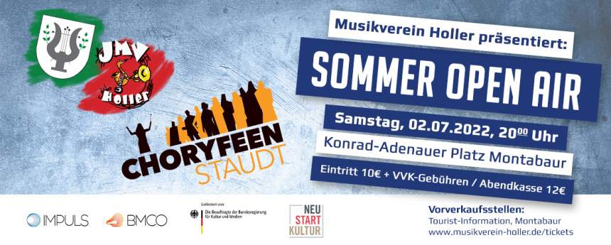 Es wird ausreichend Sitzgelegenheiten geben, aber auch an Stehtischen lässt sich das Open Air-Konzert an einem hoffentlich lauen Sommerabend mit gekühlten Getränken bestens genießen. Die ChoryFeen, der Musikverein Holler und auch die unterstützende Stadt Montabaur freuen sich schon jetzt auf einen gut gefüllten Konrad-Adenauer-Platz.