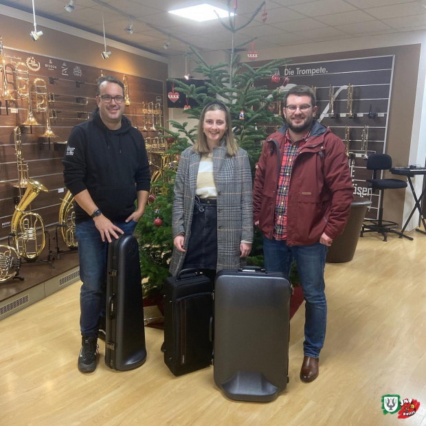 Unsere Jugendwarte Selina und Steffen haben von Tobias Jacobs, Bläserstudio Koblenz, einen gebogenen Querflötenkopf, ein Altsaxophon, ein Euphonium sowie eine Tenorposaune in Empfang genommen.
