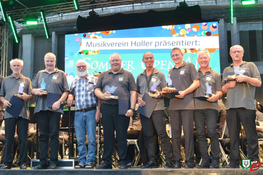 Im Rahmen unseres Sommer Open Air’s wurden langjährige Musiker für ihre Tätigkeit geehrt. Wir freuen uns, dass Wolfgang Lang, Vorstandsmitglied im Kreismusikverband Westerwald und unser Ehrendirigent, an diesem Abend die Ehrungen durchführte. Wolfgang hat selbst mit einigen der Geehrten den heutigen Jugendmusikverein ab dem Jahr 1992 maßgeblich mit aufgebaut. Unter anderem durch das starke Engagement der Geehrten steht der Jugendmusikverein heute mit einer starken Struktur und vielen Nachwuchsmusiker:innen da. Zu jedem geehrten Musiker konnte Wolfgang über gemeinsame Erlebnisse berichten, was die Ehrungen sehr persönlich machte. Wir gratulieren Theo Ferdinand, Armin Hannappel, Uli Hies, Axel Kretschmann und Thomas Weidenfeller zu 50 Jahren aktivem Musikerleben. Bereits seit 40 Jahren sind Ferdinand Wagner und Uli Wilhelmi musikalisch aktiv. Vielen Dank für Euer musikalisches Engagement! Wir sind stolz darauf, Euch zu unseren Musikern zählen zu dürfen! #ehrungen #jubiläum #mvholler #danke #kreismusikverbandwesterwald