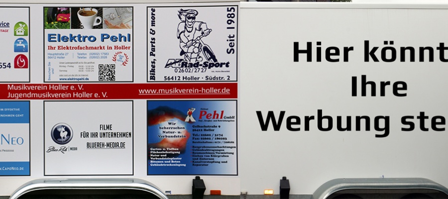 Der neue Anhänger des Musikvereins Holler ist endlich bedruckt. Wir bedanken uns bei allen Sponsoren, die uns auf diesem Weg unterstützen! Es sind noch Werbeflächen frei - wenn also auch Sie Interesse daran haben, ihre Werbung auf unserem Hänger zu veröffentlichen, setzen Sie sich bitte unter kontakt@musikverein-holler.de mit uns in Verbindung.
