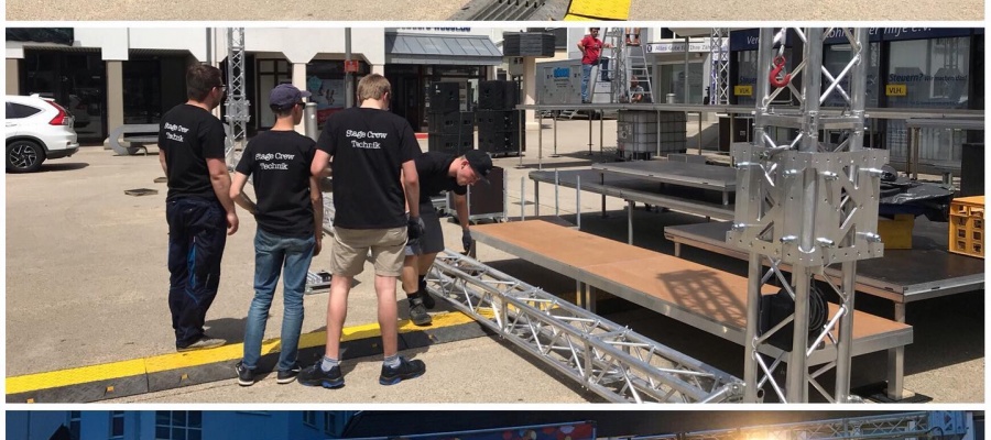 Da gibt es einiges zu tun: Absperrungen aufstellen, Bühne aufbauen, Licht- und Soundtechnik installieren, Soundchecks durchführen, und und und... Die Vorbereitungen laufen auf Hochtouren, damit wir Sie morgen Abend bestens unterhalten können.