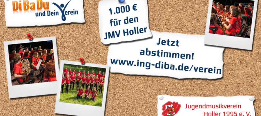 Ab sofort können Sie auf ING-Diba für den Jugendmusikverein im Rahmen der Aktion "DiBaDu und Dein Verein" abstimmen. Bei dieser Aktion werden deutschlandweit insgesamt 1.000.000 Euro an 1.000 gemeinnützige Vereine gespendet. Dabei zählt jede Stimme, denn die 1.000 dort registrierten Vereine, die bis 3. Juni 2014 die meisten Stimmen sammeln, erhalten diese Spende in Höhe von 1.000 Euro.